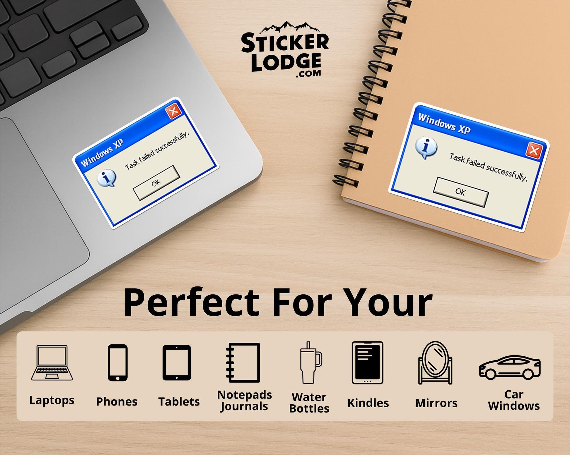 Our Windows XP Task Failed Successfully Vinyl Sticker is waterproof, durable, and perfect for personalizing your laptops, water bottles, phone cases, tablets, Kindles, planners, notebooks, journals, tumblers, mugs, mirrors, cars, motorcycles, and more!