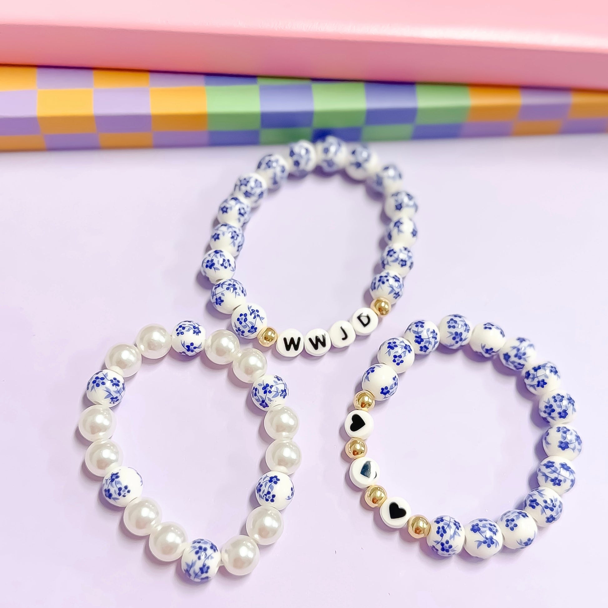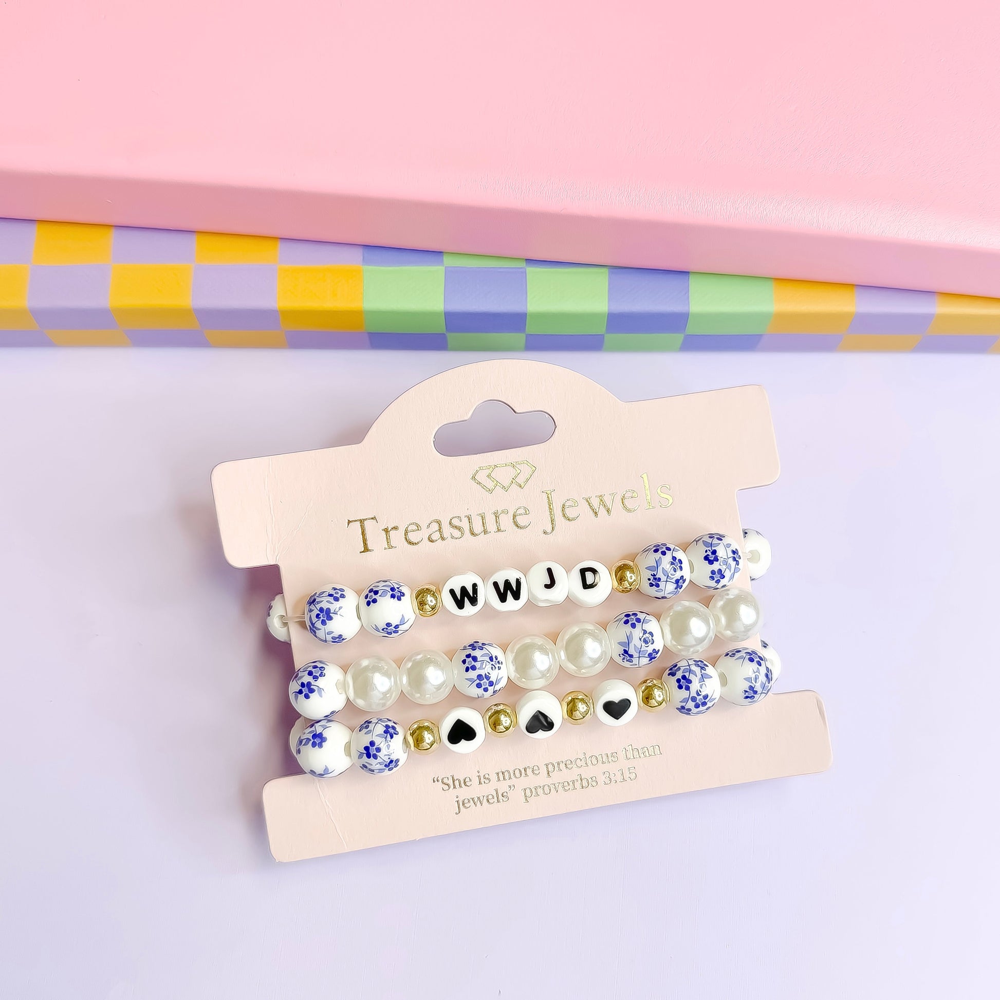Carry faith and beauty with you everywhere with the WWJD Bracelet Set. Featuring classic blue floral beads, elegant pearls, and the meaningful “WWJD” (What Would Jesus Do) lettering, this stretchy trio is a perfect reminder of purpose and style. Layer them, gift them, or wear them daily as a beautiful reflection of your heart.